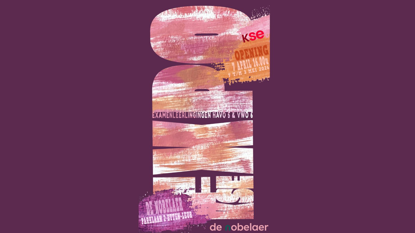 Van dinsdag 7 april tot en met zondag 3 mei krijg je de unieke kans om een brede selectie eindexamenwerken van havo 5- en vwo 6-leerlingen (KuBv) van de KSE te bewonderen.